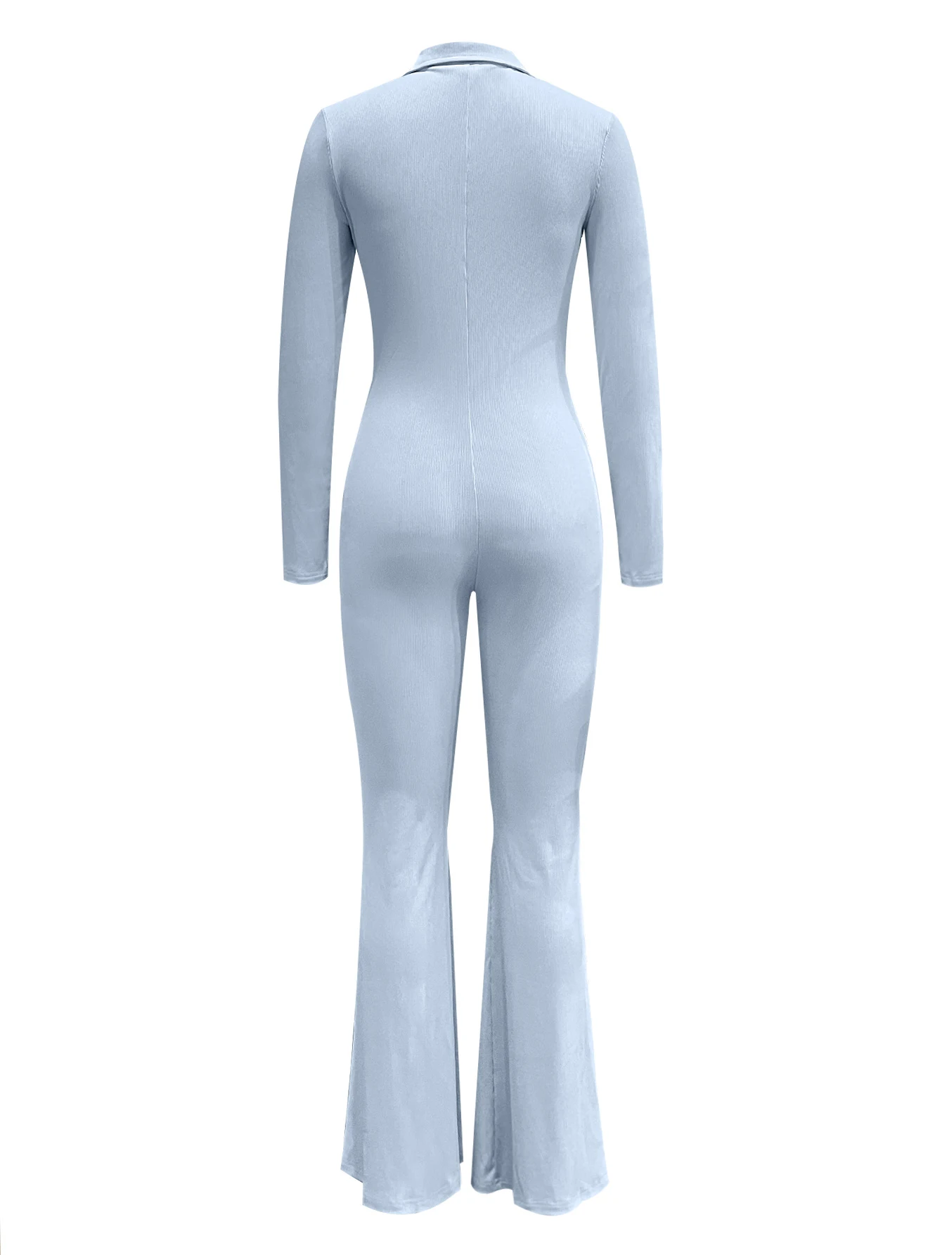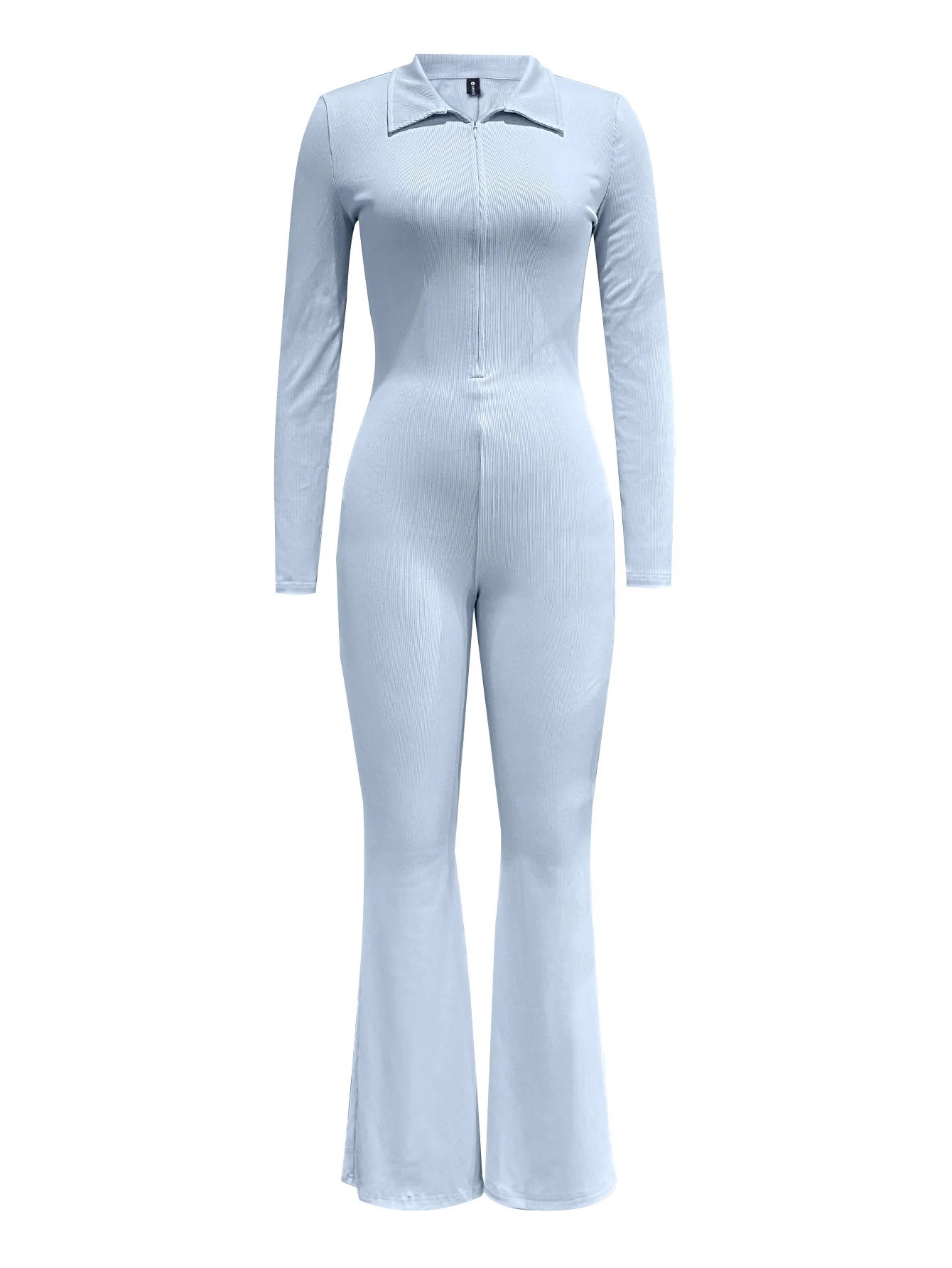 Elegant V-Neck Long Sleeve Skinny Flared Jumpsuit Zipper Design Women's Autumn Sporty Chic Ankle-Length Polyester Jumper