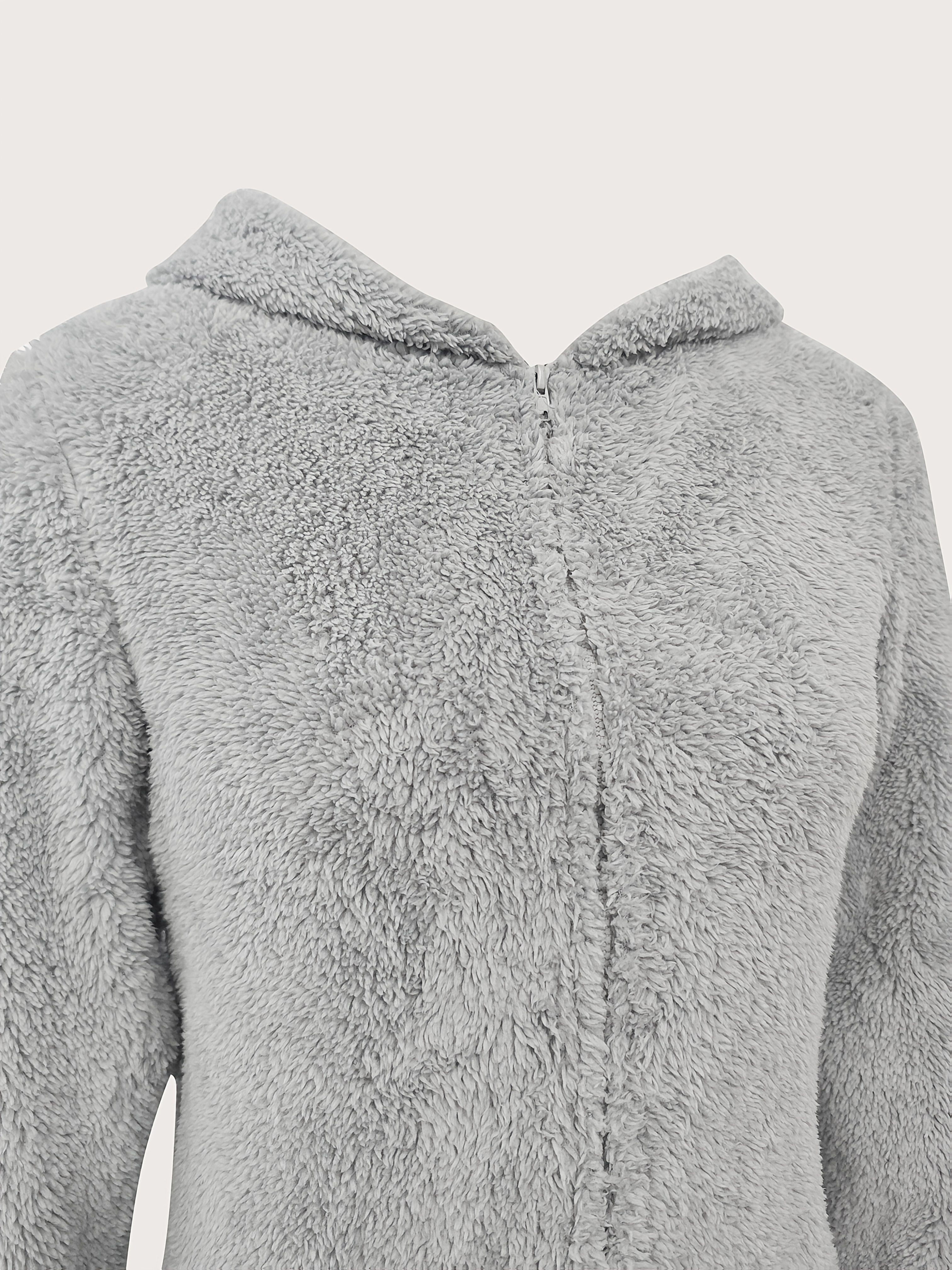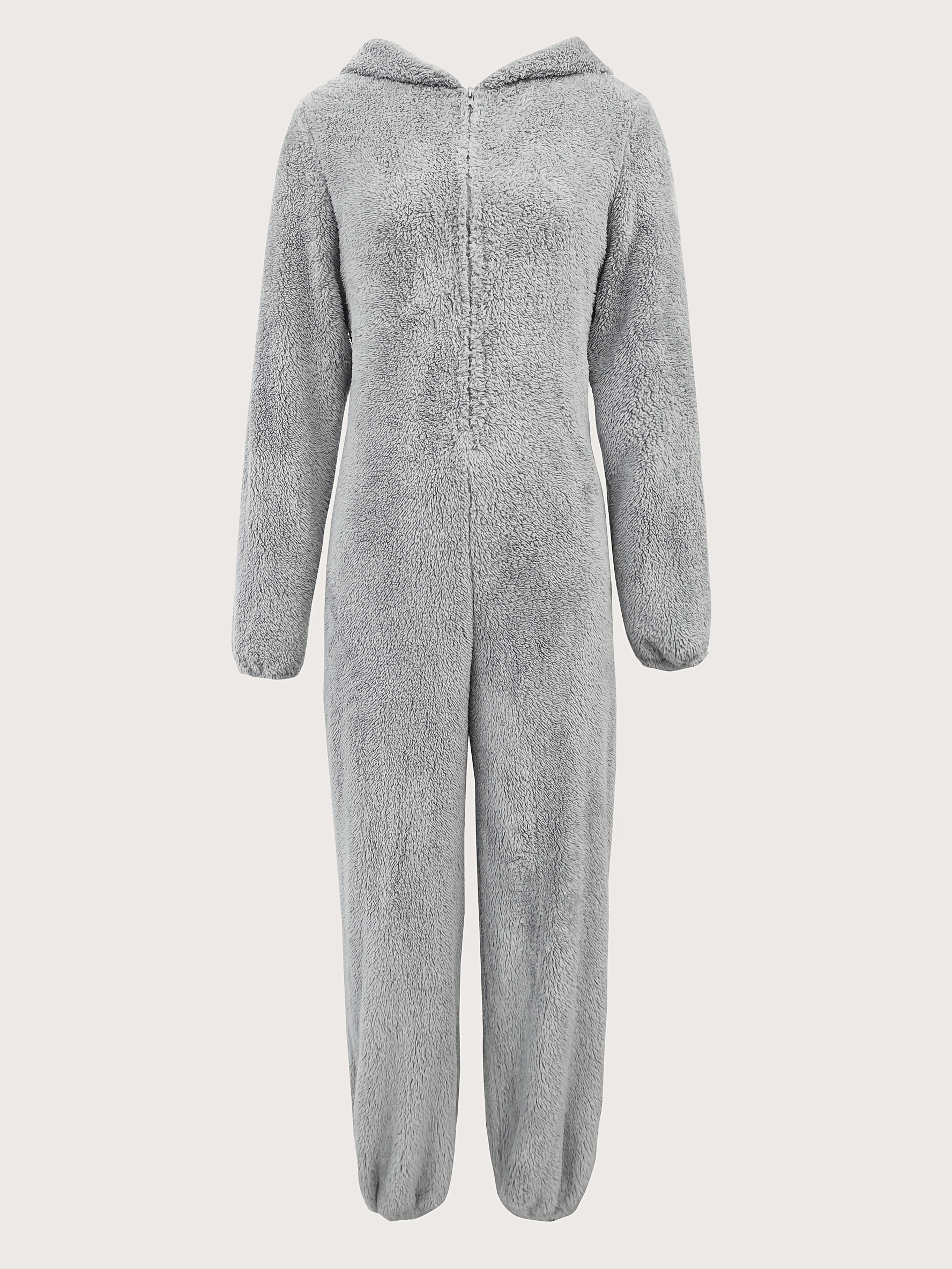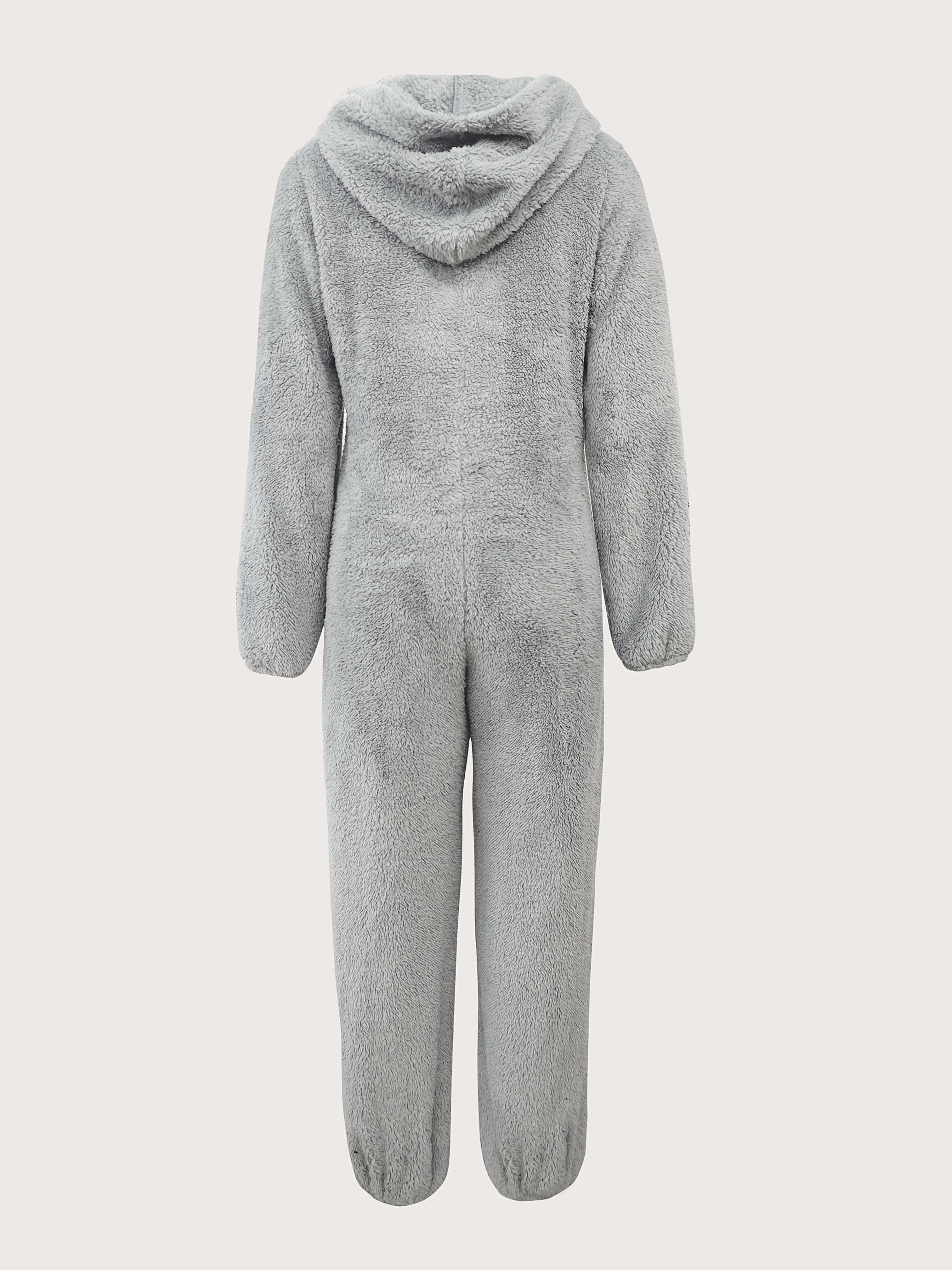 Solid Fuzzy Zip Up Hooded Jumpsuit, Casual Long Sleeve Warm Jumpsuit for Fall & Winter, Women's Clothing
