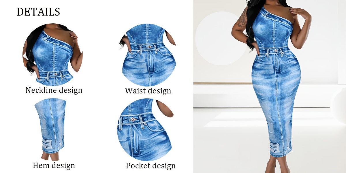 Women’s Off-Shoulder Denim Print Bodycon Dress – Slim Fit Casual to Evening